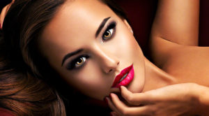 Beautiful woman with bright eye makeup and red lips lying on t