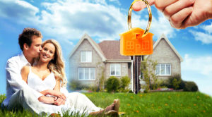 Happy family near new home.